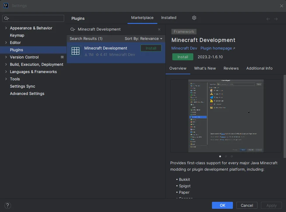 The first thing you need to do is install the Minecraft Development plugin. You can do this by going to File > Settings > Plugins and searching for Minecraft Development under the Marketplace section.